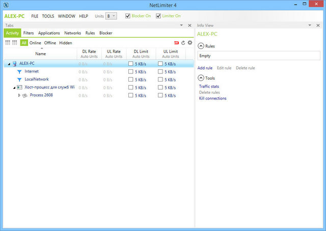 NetLimiter - программа, решающая проблему контроля сетевого трафика. NetLimiter следит за деятельностью каждого приложения, использующего доступ к Интернету, а также активно управляет трафиком, контролируя скорость потока данных. Вы можете самостоятельно настроить скорость загрузки и отправки информации для каждого отдельного приложения или соединения. Таким образом, если какая-то программа в ходе своей работы слишком активно потребляет сетевые ресурсы, то у вас есть реальный шанс умерить ее аппетит. Также NetLimiter ведет подробную статистику по всем соединениям, отображая ее в виде графиков или таблиц.