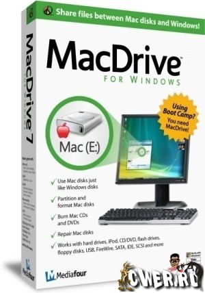 MacDrive - программа, позволяющая пользователям PC компьютеров открывать, редактировать и сохранять файлы на носители, отформатированные под формат компьютеров Macintosh. Утилита позволяет работать с дискетами, дисками CD-ROM/DVD-ROM, дискетами ZIP-драйвов и другими носителями. При этом, для пользователя работа MacDrive прозрачна: в программах Windows диски, созданные на Mac, видны и работают так же, как и обычные тома NTFS или FAT. MacDrive позволяет разбивать Mac-диски на разделы и форматировать их, также есть возможность записи компакт-дисков CD-ROM/DVD-ROM в формате Macintosh. Кроме этого, имеется возможность проверки и устранения ошибок на Mac-дисках. Восьмая версия программы теперь имеет полную поддержку новой Windows 7.