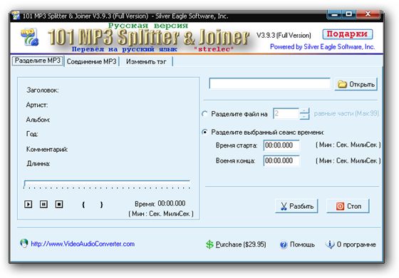 Удобная программа для вырезания части, разрезания на куски или склеивания в одно единое целое музыкальные файлы формата Mp3. Используется для изготовления рингтонов для мобильного телефона, сборки аудиокниги, сборки живого концерта без комментариев и аплодисментов и пр. Процесс происходит без потери качества, т е без переходной переупаковки в wav и слияние возможно объемом до 1000 минут или 1 Гб. Работает также и с переменным битрейтом - VBR и имеет проигрыватель предварительного прослушивания.