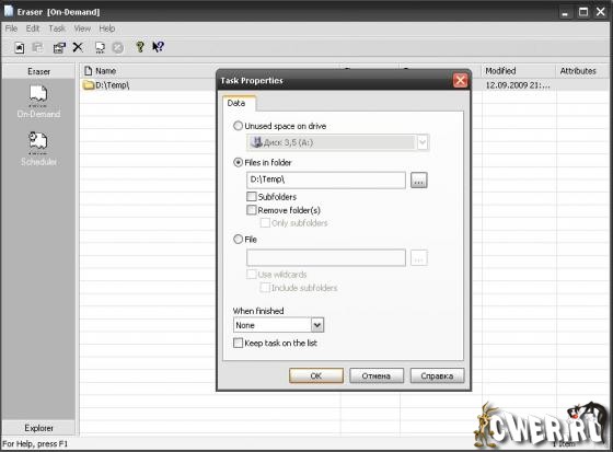Eraser - программа для полного безвозвратного удаления информации. Принцип действия заключается в многократной перезаписи кластеров, которая продолжается до тех пор, пока все фрагменты информации не будут удалены. Для безвозвратного уничтожения можно выбирать как отдельные файлы, так и целые папки и диски. Кроме стирания конкретных данных программа способна выполнить "зачистку" остатков информации на неиспользованном дисковом пространстве. Предусмотрен встроенный планировщик.
