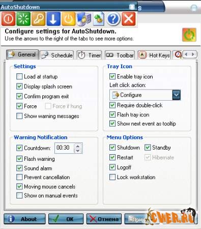 Программа для автоматического выключения и перезагрузки компьютера. AutoShutdown Pro - это системный менеджер, который может без посторонней помощи выключить, перезагрузить, отправить в ждущий или спящий режим ваш компьютер, а также заблокировать его. Все эти действия программа может проделать в зависимости от указанного в настройках дня и часа, при отсутствии активности пользователя или при разрядке батарей. Программа также может очищать временные файлы, Корзину, список недавно открытых документов, cookies.