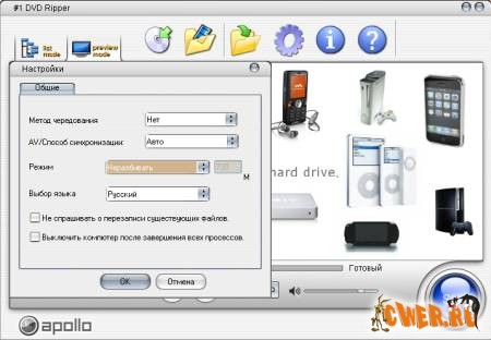 Программа умеет конвертировать DVD в форматы портативных устройств MP4/H264, MP3, M4A, AAC for iPod, iPhone, Apple TV, PSP, Zune, Creative Zen players и другие.