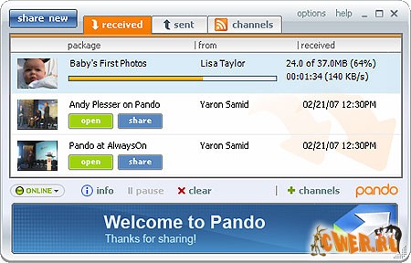 Инструмент безопасного обмена данными, предназначенный для использования как индивидами, так и крупными компаниями. По задумке разработчиков, новый программный продукт решит ряд проблем с пересылкой больших файлов в глобальной сети по электронной почте. Пользователи Pando смогут обмениваться файлами размером до 1GB. Pando - это бесплатный продукт, позволяющий пересылать и получать файлы и директории любого размера в Ваш почтовый ящик. На самом деле в почтовый ящик попадает тщательно зашифрованный маленький файл с расширением *.pando, где и находится информация о местонахождении нужного Вам файла. Причем понять, где же собственно находится искомый файл совершенно невозможно. Да и сам пересылаемый файл тоже тщательно упаковывается-шифруется в процессе передачи в специальные пакеты-посылки.