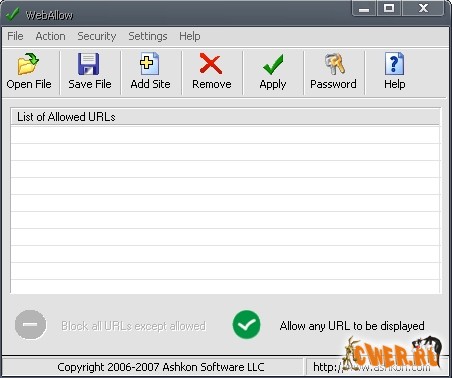 Программа ограничивает доступ к сайтам. WebAllow создана для родителей: если вы волнуетесь, что ваш ребенок вместо выполнения домашних уроков сидит в интернете, то вы запросто можете этому противостоять. Вы просто должны составить список "разрешенных" сайтов, загрузить их в программу и активизировать блокировку. После этого вы можете быть уверены, что Internet Explorer будет загружать только те сайты, которые были внесены в список "разрешенные". Программа WebAllow также может быть использована в школах, чтобы блокировать запрещенные сайты от школьников, и в библиотеке, чтобы выход в Интернет был только в их каталог.