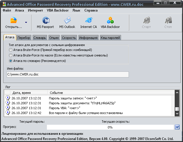Advanced Office Password Recovery (AOPR) - программа для восстановления забытых паролей к документам Microsoft Office всех версий, существующих на данный момент (Office 95, Office 97, Office 2000, Office XP, Office 2003, Office 2007). Также программа позволяет восстанавливать пароли MS Money, MS Visio, MS Backup и пароль IE Content Advisor. Программа поставляется в трех редакциях - Home, Standard и Professional. Большинство паролей находятся мгновенно, прямым декодированием. Программа имеет как английский, так и русский интерфейс.