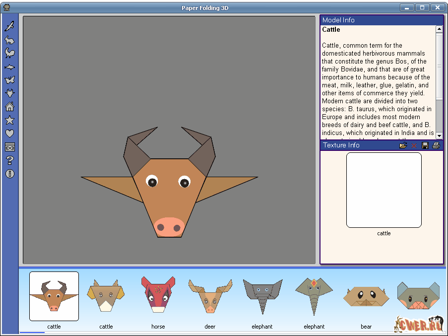 Paper Folding - это трёхмерный самоучитель, с помощью которого простой лист бумаги можно превратить в произведение искусства. В программе 130 моделей разнообразных животных и объектов на которые можно "натянуть" 180 красивых цветных текстур.