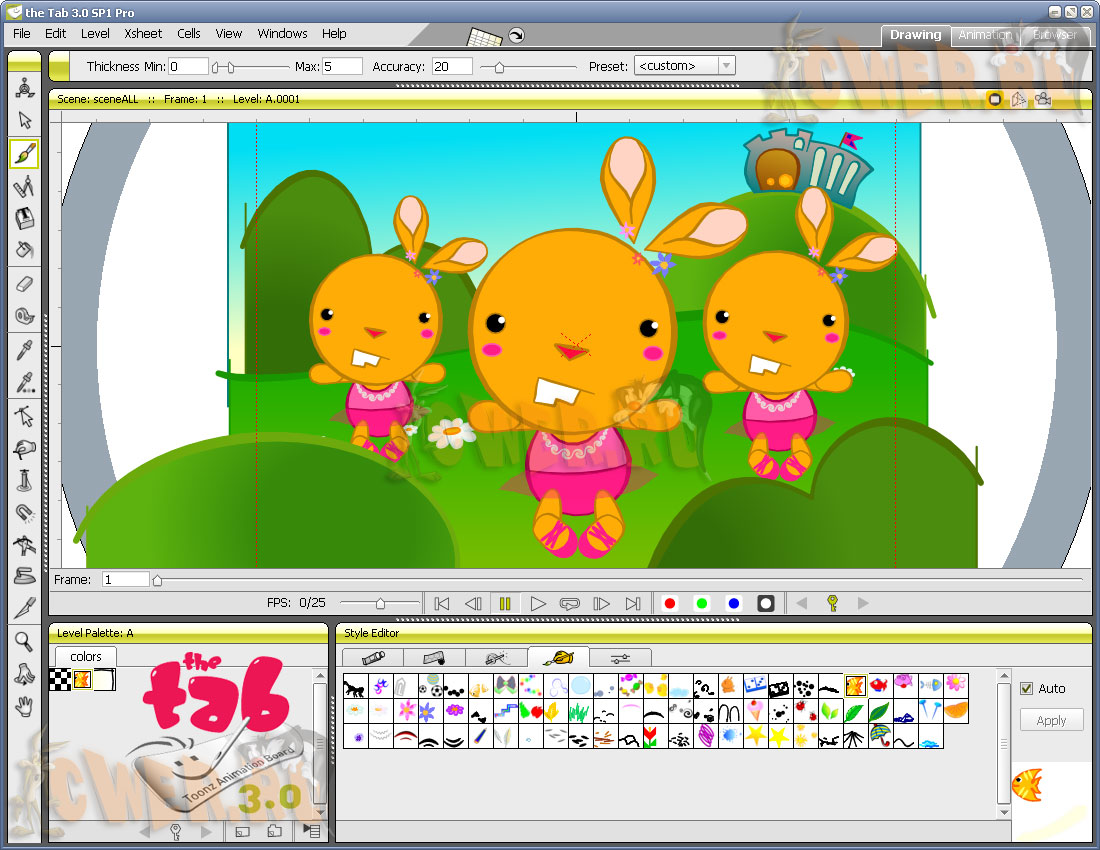The TAB 3.0 Professional дает художникам-мультипликаторам больше инструментальных средств для создания анимации. Новые возможности программы позволяют добавить "мощность" мультипликациям, усовершенствовать большинство особенностей, уже доступных, и ускорить процесс создания анимации. С новыми технологиями обработки линий и цвета, Вы можете наконец создать естественный образ. И благодаря передовым анимационным функциям, таким, как inbetweening и scene planning, анимация делается просто.