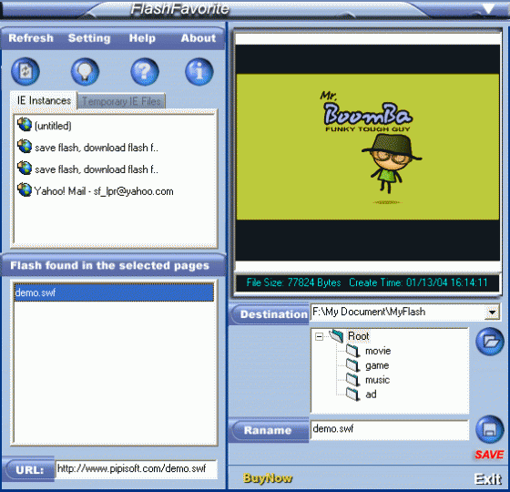 Программа вытаскивает Flash-ролики из кеша браузера Internet Explorer, после чего можно свободно их просмотреть. Утилита позволяет сохранить ролики, отображаемые в открытом окне браузера. Flash Favorite самостоятельно встраивается в панель инструментов Internet Explorer, что делает доступ к программе более удобным и быстрым.