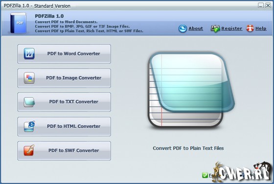 PDFZilla - программа которая быстро и аккуратно конвертирует PDF файлы в документы MS Word, документы Rich Text, текстовые файлы, изображения, HTML файлы и Flash SWF файлы.