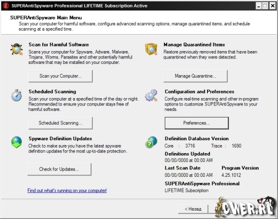 SUPERAntiSpyware Professional сканирует память, реестр и файлы на предмет заражения шпионскими модулями. Средствами программы найденных паразитов можно удалить или поместить в карантин.