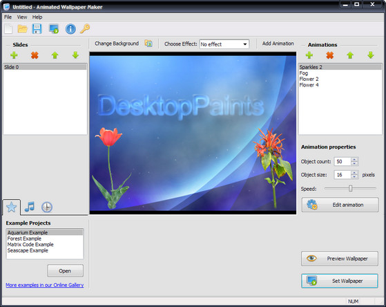 Animated Wallpaper Maker - превратит статичные изображения в анимированные картинки и установит их в качестве обоев рабочего стола. Вы сможете анимировать абсолютно любое изображение. Вам не понадобятся дорогие, сложные программы! Вы сможете создать анимированные обои всего за пару минут. Загрузите изображение, настройте параметры анимации и поместите результат на рабочий стол. В программу входит редактор, позволяющий добавлять анимацию к стандартным обоям Windows (поддерживает все популярные графические форматы) и встроенный плеер, замещающий статичный фон анимированными обоями. Анимированные обои используют минимум системных ресурсов и по желанию могут быть включены или отключены. Вдохните новую жизнь в свой рабочий стол!