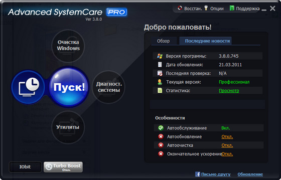 Advanced SystemCare Pro - проводит анализ системы, после чего производит оптимизацию системной конфигурации, в том числе изменяет на оптимальные настройки безопасности, удаляет из системы Spyware и Adware, исправляет ошибки в системном реестре, удаляет временные файлы, оптимизирует параметры интернет-соединения, позволяет управлять автозагружаемыми приложениями, производит дефрагментацию файловой системы и т.д. и т.п. Благодаря возможностям данной программы вы сможете очистить ваш компьютер от шпионского и рекламного ПО, обнаружить и заранее устранить возможные угрозы и бреши в системе безопасности ОС.