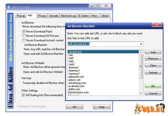 Ultra Ad Killer - небольшой по размеру, но эффективный блокировщик всплывающих окон, рекламных вставок, баннеров и т.д.. Ultra Ad Killer включает в себя все основные функции, начиная с блокировки всплывающих окон, и заканчивая способностью стирать следы Вашей "интернетовской" деятельности. Работает из трея.