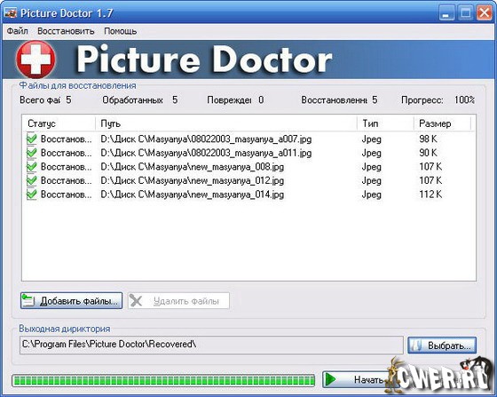 Picture Doctor утилита для восстановления повреждённых графических файлов. Работает с форматами JPEG, BMP и PSD. Picture Doctor использует специальный алгоритм работы, благодаря чему восстановленные изображения не отличаются от исходных по качеству, разрешению и цветовой палитре. В случае восстановления файлов PSD программа не теряет данные слоёв и полученное изображение корректно отображается. Возможна работа утилиты с потоком файлов одного формата.