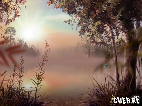 Застывшая водная гладь отражает лучи восходящего солнца, робко пробивающиеся сквозь дымку. На середине озера, наполовину скрытая туманом, застыла рыбацкая лодка. Приятная музыка сопровождает пробуждение природы.