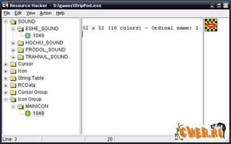 Resource Hacker - Утилита чтобы рассмотреть, декомпилировать, модифицировать и компилировать ресурсы в модулях Win32. Диалоги, меню, и строковые сценарии ресурсов (также формы Borland) могут быть отредактированы используя внутренний редактор и немедленно перекомпилированны.