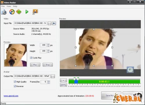 Video Avatar - инструмент для того, чтобы создать анимированный GIF-аватар, userpic или подпись. Вы можете выбрать видео файл и его часть и затем изменить границы по вашему желанию для вашего автара. При использовании Video Avatar Вы можете создать оригинальные анимированные аватары для ваших блогов, ЖЖ, софтварезных и тематических сайтов. Вы можете также установить userpic в вашей странице профиля на любом форуме, сообществе, вашем вебсайте и т.д.