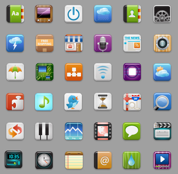 Предлагаю скачать замечательный сборник различных иконок для вашего индивидуального оформления мультимедийного устройства. Формат иконок позволяет использовать их и в других сферах графического творчества.