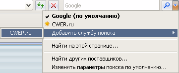 Зайти на любую страницу нашего сайта и кликнуть левой кнопкой мыши на разворачивающемся списке поисковых плагинов в панели поиска. Выбираем пункт "Добавить службу поиска", в дочернем меню выбираем CWER.ws: