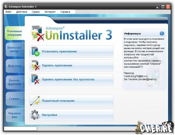 Ashampoo UnInstaller отслеживает и регистрирует изменения, которые вносят инсталляционные программы, что позволяет при необходимости корректно - то есть полностью - удалить ненужную программу. Положительным качеством является то, что UnInstaller удаляет не только те приложения, что были установленны с ее помощю, но и путем анализа деинсталлирует программы, мониторинг которых не производился. Кроме своей основной функции программа может: искать и удалять пустые папки; одинаковые и временные файлы; просматривать список всех установленных в системе шрифтов и удалять ненужные; удалять временные файлы Интернета, 'кэшированный' контент, файлы cookies, адреса сайтов введенные в ручную.