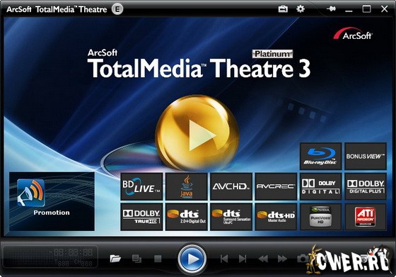 TotalMedia Theatre Platinum - программа для проигрывания Blu-Ray и DVD дисков. Программа способна улучшить общее впечатление от просмотра фильма – для этого предназначено множество функций, которых вы не найдете в стандартном DVD-проигрывателе. Стильный, интеллектуальный интерфейс, простой даже для новичков, имеющий широкий ассортимент возможностей, обязательно оценят энтузиасты видео. Программа поддерживает воспроизведение Blu-ray дисков в форматах HD MPEG-2, AVC, VC1, а также проигрывает CD, VCD и AVCHD диски. На сегодня, это единственный плеер, который даже в своей последней версии может проигрывать образы из папки BDMV на жестком диске. Также с данной программой поставляется плагин SimHD, который позволяет превратить стандартный видеопоток в изображение высокой четкости, по качеству близкое к стандарту HD.