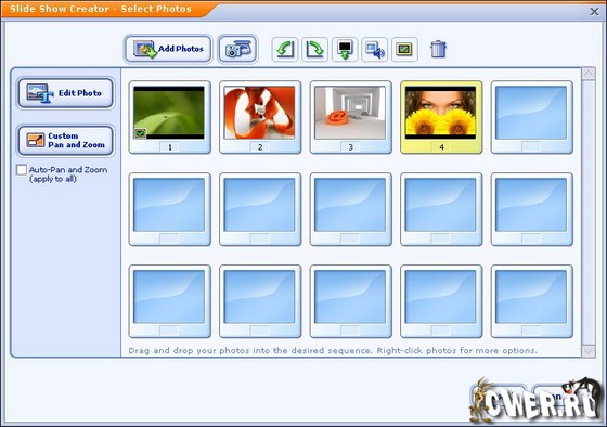 Like a program within a program, the slideshow editor includes all the tools you need to create eye-catching photo presentations. Slideshow tools include: drag-n-drop storyboard, background music, photo enhancement, slide transitions, pan & zoom effects, titling, voice narration, menu thumbnail selection, and slide interval.