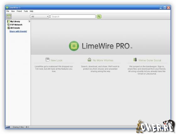 LimeWire - программа, предназначенная для обмена файлами между пользователями. LimeWire отличается от программ аналогичного назначения тем, что совместима практически со всеми P2P сетями. Если вы не знакомы с этой программой, то, чтобы её освоить, вам придется приложить некоторые усилия. Зато после её освоения вы сможете начать поиск и скачивание интересующего файла в бескрайних просторах интернета. После первого запуска LimeWire подключается к своему центральному серверу, анализирует состояние сети и делает запрос на интересующий вас файл. Можно искать всё, что угодно: MP3, игры, программы, картинки, текстовые документы разнообразных форматов и т.д. Для работы требуется наличие Java. Поддерживаются скины.