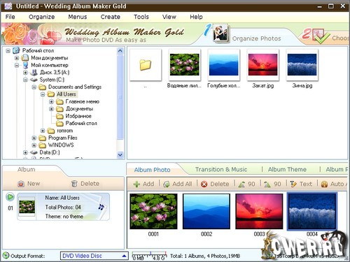 Wedding Album Maker Gold – это профессиональная программа фотоальбома, которая создает впечатляющее слайд шоу из свадебных фотографий с музыкой, переходами и DVD меню. Данная программа позволяет быстро и легко создать впечатляющие свадебные альбомы на DVD видео диски, чтобы поделиться своей историей любви по свадьбе с другими людьми. Новая версия поддерживает больше выводных форматов, такие как: MPEGI, MPEGII, MPEG-4, MP4 for iPod, PSP, 3GP сотовые телефоны, FLV , XVid AVI, AVI, видео форматы для Anrchos, Creative Zen Vision, iRiver PMP 100, YouTube, MySpace.