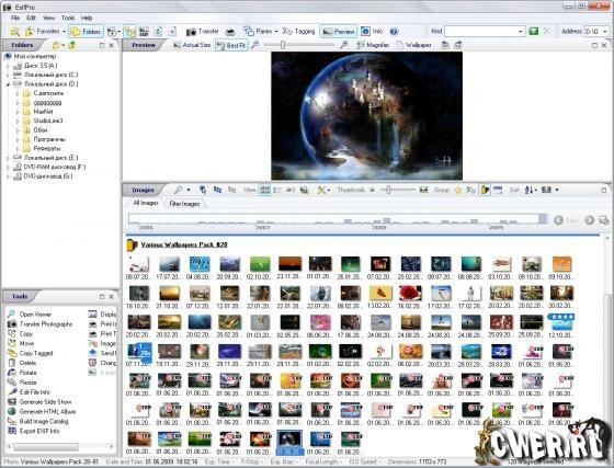 ExifPro - приложение, предназначенное для отображения, обработки и просмотра фотографий. Программа позволяет отображать изображения в нескольких режимах. Выделенные изображения вы сможете копировать, изменять в размерах, обрезать и всячески настраивать, используя инструменты, встроенные в программу. Также данная программа позволяет отображать EXIF информацию, встроенную в фотографии, описывающей различные параметры фотокамеры, которая была использована во время снимка. С помощью программы можно создавать HTML альбомы, слайд-шоу, с использованием встроенных в программу генераторов, печатать изображения, добавлять описания и теги к изображениям. Отдельное окно просмотрщика предлагает пользователю инструменты для масштабирования и панорамирования, коррекции цвета и вида изображений, инструмент лупы и режим слайд-шоу.
