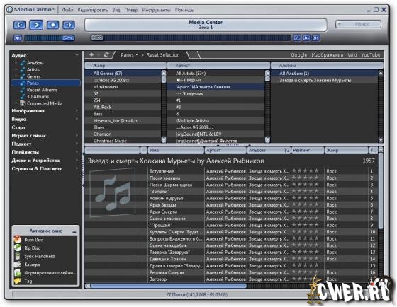 J.River Media Center - мультимедийный центр. Проигрывает большинство популярных аудио и видео форматов, включая MP3, аудио CD и DVD, может преобразовывать CD-аудиотреки в WAV и MP3, переписывать на жесткий диск виниловые диски и кассеты, а также создавать аудио-CD, причем для всех этих функций программа имеет множество настраиваемых параметров. Кроме этого, есть очень хороший и мощный по своим возможностям органайзер мультимедийных файлов, медиаредактор, эквалайзер, встроенный DSP и удобный планировщик заданий для автоматизации процессов проигрывания/записи, а также поддержка пульта ДУ. Из необязательных, но приятных функций - становящаяся уже почти стандартом для "приличных" программ возможность изменения внешнего вида с помощью скинов, мини-режим проигрывателя и "телевизор".