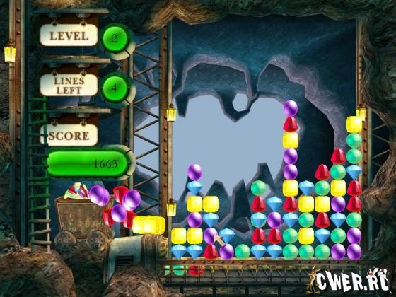 Снизу появляются всё новые и новые ряды самоцветов, и если какой-либо ряд достигнет верха, игра закончится. Игра очень проста в управлении – одной лишь левой кнопкой мышки. Вы можете играть в Gem Mine в двух различных режимах – «аркада» или «головоломка», каждый дает неповторимое ощущение игры!