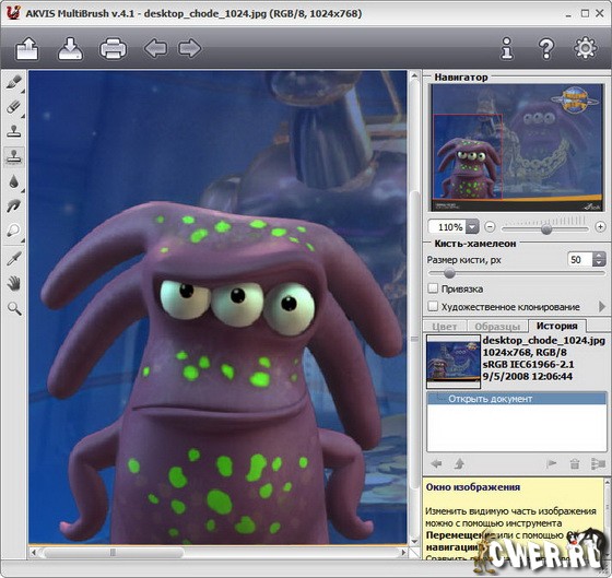 Кисть-хамелеон, как видно из названия, маскирует изъяны, устраняет недостатки изображения с помощью других участков этого же изображения с сохранением исходных цветов, теней, текстуры, освещения. В результате восстановленный участок или клонированный объект легко вписываются в исходное изображение. Эта кисть по способу воздействия похожа на инструмент Healing Brush, который используется в Adobe Photoshop, но Кисть-хамелеон обладает еще большими возможностями по управлению и дает более точный, очень качественный результат.