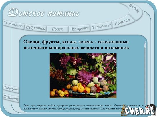 Для нормального развития ребенка необходимы не только любовь и забота близких, но и правильное питание. Здесь в 5 разделах представлена информация об особенностях здорового детского питания: Характеристики пищевых веществ; Питание беременных женщин; Кормление от рождения до 1 года; Ранний дошкольный и школьный возраст; Особенности деского питания.