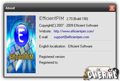 EfficientPIM - эффективный полнофункциональный Персональный Информационный Менеджер (PIM), дополненный модулями: заметок-напоминаний в виде "липких листочков" на экране; менеджера любимых закладок интернет-браузера и пароль-менеджера с генератором паролей. Все это, вместе собранное, в виде контактов, назначений, задач, списков "сказано-сделано", годовщин и дней рождения близких и знакомых людей и прочего, сделает вашу жизнь более плодотворной и успешной, а работу более организованной и эффективной. И как это хорошо, что с EfficientPIM все вещи, которыми вы должны управлять, расположены теперь в одном, удобном в работе интерфейсе.