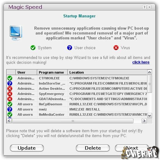 Magic Speed - программа для оптимизации работы операционной системы и очистки её от ненужных данных. В ней присутствуют средства для поиска и исправления ошибок в реестре Windows, проведения очистки системы от скопившихся временных файлов и включения некоторых опций операционной системы, повышающих её быстродействие. Magic Speed может анализировать автоматически запускаемые приложения, позволяя отключать загрузку неиспользуемых программ, а встроенный антивирусный движок поможет выявить среди них шпионские модули и другие вредоносные процессы. Кроме того, здесь имеются инструменты для дефрагментации оперативной памяти и ускорения загрузки системы. Для работы с приложением не требуется глубоких знаний ПК, все действия осуществляются с помощью пошагового Мастера оптимизации.