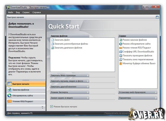 DownloadStudio - это универсальный комбайн для скачивания файлов и сайтов из Интернета. С ее помощью вы можете скачивать файлы в многопотоковом режиме, закачивать отдельные страницы или целые сайты для просмотра их в offline-режиме, а также осуществлять захват видеоизображения с экрана компьютера. Использование данной программы позволит вам отказаться от установки на компьютер программ, выполняющих все вышеперечисленные функции раздельно.