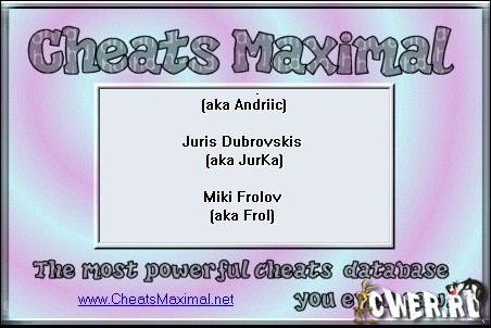 CheMax - наибольшая из известных на данный момент программ, которые являют собой базу данных с кодами для игр. Простой и красивый интерфейс, малый размер, и при этом огромное количество представленных игр. Особенностью базы является отсутствие в ней хинтов и прочей “отсебятины“, вашему вниманию представлены только коды (cheats, hex-cheats) и пароли (passwords).