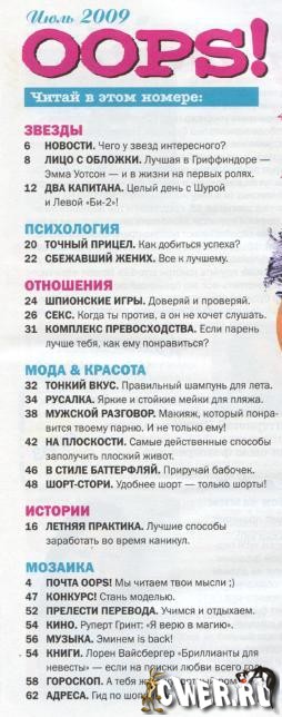 Oops! (Упс) — ежемесячный журнал для стильных девушек, для тех, кто только открывает для себя мир глянцевых женских журналов. Oops! — это новые тенденции моды для молодых красавиц, советы экспертов по косметике и уходу за собой, а также специальные репортажи по самым важным проблемам, какие только могут волновать девушек на пороге взрослой жизни. В каждом номере — интервью с российскими и зарубежными звездами, новости музыки и кино, романтические истории о любви, рекомендации по имиджу от лучших стилистов и увлекательные путешествия. А еще — точный гороскоп на месяц и смешные истории от читателей. Oops! постоянно проводит конкурсы красоты среди читательниц, многие из них с успехом приняли участие в фотосессиях и появились на обложке журнала.