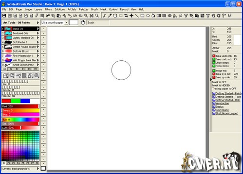 TwistedBrush Pro Studio - программа для художников. Она имеет большое количество самых разнообразных инструментов для рисования, от красок до мелков и карандашей. Эта программа глубоко поражает буквально с первого запуска. Интерфейсом Twisted-Brush мало похож на другие редакторы, хотя и предоставляет все необходимые возможности: работа с буфером обмена, зуминг и, конечно же, рисование. Причем рисующий инструмент только один — кисточка, зато количество (более 3000 штук!!!) и качество пресетов для рисования, а также многообразие форм и регулируемость размеров и цветовой гаммы позволяют человеку, не особо одаренному художественными талантами, буквально за пару минут изобразить то, что — возможно, более аккуратно и качественно, конечно — профессионал, работающий в другом редакторе, рисовал бы, наверное, не один час.