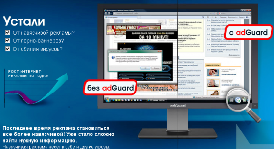 AdGuard 2.0 - программа от отечественных разработчиков, разработанная для блокировки интернет-рекламы, порно-окон, баннеров и вирусов. Если вы устали от всплывающих окон с порнографией и вирусами и хотите защитить себя и близких от этих раздражителей – AdGuard именно то, что вам нужно. Программа делает работу в интернете гораздо более безопасной и предсказуемой. AdGuard, работает во всех браузерах, регулярно обновляется, ускоряет загрузку веб-сайтов.Программа написана специально под Рунет, то есть "знает" всю существующую рекламу и не требует настройки или обучения.