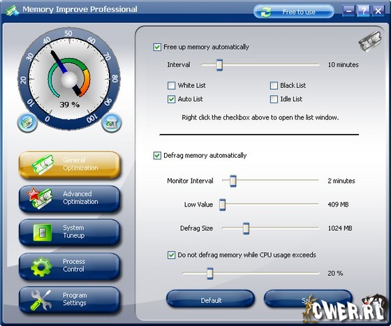 Memory Improve Professional – это один из полезных инструментов, который в информативной форме в виде прибора показывает текущее состояние потребления памяти и может автоматически или вручную производить дефрагментацию и освобождать для вас ресурсы в виде дополнительной памяти. Это в целом улучшит работу системы, уменьшит время её загрузки и повысит её производительность.