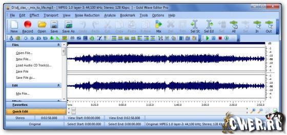 Gold Wave Editor является мощной программой для записи, анализа и редактирования звука. Вы можете записывать звук с микрофона, подключенного к аудиокарте вашего компьютера, или любого другого устройства - радиоприемника, телевизора, аудио или видеомагнитофона, CD/DVD проигрывателя, системы спутникового ТВ и т.д Встроенный аудио редактор позволяет вам обрезать, делить и объединять ваши записи, добавлять к ним звуковые эффекты и фильтры. При помощи встроенного CD-риппера вы сможете копировать любимые треки с ваших аудио CD дисков и сохранять их с максимально возможным качеством в wav, wma, mp3 или ogg форматах. Кроме этого имеется функция конвертирования аудио файлов из одного формата в другой, возможность добавления и редактирования дополнительной информации в аудио файлах, восстановления аудио файлов с некачественным звучанием. В последнюю версию Gold Wave Editor добавлена программа записи дисков, позволяющая создавать ваши собственные аудио CD, которые могут быть прослушаны на компьютере, домашнем проигрывателе и пр.