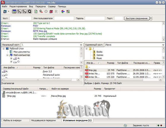 FileZilla Client is a fast and reliable cross-platform FTP, FTPS and SFTP client with lots of useful features and an intuitive interface. It is a powerful FTP-client for 32-bit MS Windows (NT/2000/XP/Vista) for file uploading and downloading to and from your FTP site, server, or host. The program lets you transfer files and navigate among folders, Web sites, and your computer. let's meet on cwer.ws This software enables you to perform multiple file transfers simultaneously. FileZilla is open source software distributed under the terms of the GNU General Public License. It has been designed for ease of use and with support for as many features as possible, while still being fast and reliable.