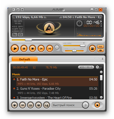 AIMP - программа, которая разрабатывалась как аналог всем известного медиаплеера Winamp. На данный момент программа включает в себя множество дополнительных модулей: CD-Ripper, Tag Editor, Audio-player, аудио конвертер, запись аудио и дисков с данными и многое другое. AIMP заменяет множество программ, благодаря чему теперь не нужно искать специальный софт, скажем, для перегона Audio-CD в MP3 - это уже предусмотрено в AIMP. Программа позволяет воспроизводить без плагинов множество форматов, включая WAV, MP3, MP2, MP1, OGG, WMA, UMX и многие другие. Интерфейс программы выглядит очень стильно, а также имеет многоязычную поддержку, включая русский язык.