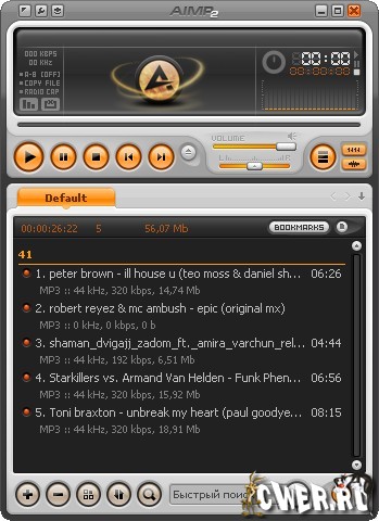 IMP - программа, которая разрабатывалась как аналог всем известного медиаплеера Winamp. На данный момент программа включает в себя множество дополнительных модулей: CD-Ripper, Tag Editor, Audio-player, аудио конвертер, запись аудио и дисков с данными и многое другое. AIMP заменяет множество программ, благодаря чему теперь не нужно искать специальный софт, скажем, для перегона Audio-CD в MP3 - это уже предусмотрено в AIMP. Программа позволяет воспроизводить без плагинов множество форматов, включая WAV, MP3, MP2, MP1, OGG, WMA, UMX и многие другие. Интерфейс программы выглядит очень стильно, а также имеет многоязычную поддержку, включая русский язык.