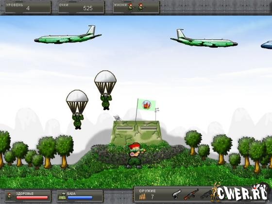 Ты - десантник-диверсант. Твоя миссия - защитить военную базу, расположенную на острове от атак военно-воздушных сил противника. Периодически придется воевать с вражеским десантом.