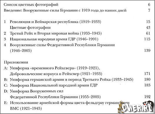 Большинство из множества фотографий опубликовано впервые. Отдельно приводятся оригинальные таблицы формы одежды и знаков различия четырех германский армий, сменявших одна другую и существовавших одновременно на протяжении нескольких исторических эпох.