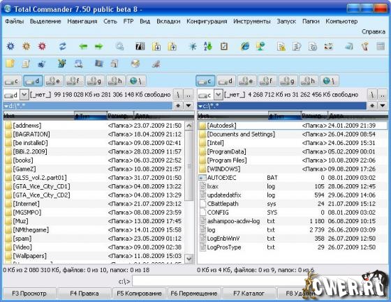Total Commander - популярный файловый менеджер с практически всеми необходимыми для таких программ функциями. Кроме всех функциональностей, характерных для файловых менеджеров, в Total Commander встроены очень удобные просмотрщики для мультимедиа и графических файлов, распаковщики ZIP, ARJ, LZH, RAR, UC2, TAR, GZ, CAB, ACE и дополнительные dll для других архивных файлов; встроенный ftp-клиент - вообще просто прелесть: можно скачивать/закачивать файлы в несколько потоков, есть докачка, поддержка www-прокси при работе с ftp и есть даже такая функция, как подключение-скачивание-отключение в заданное время к заданному ftp. Не будут лишними и такие функции, как UUE/MIME/XXE кодирование/декодирование и разрезка/склейка длинных файлов, а также множество других функций, крайне необходимых для работы с файлами.