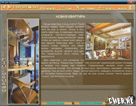 Любая квартира представляет собой своеобразную мини-сценку, где постоянно можно наблюдать сценки из нашей повседневной жизни. Именно поэтому однообразие нам быстро надоедает и смена декораций нам просто необходима, наилучший помощник в этом - диск "Евроремонт".