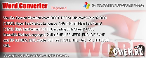 Простой и удобный конвертер офисных файлов в любом направлении между MicroSoft Word 2007 (*.DOCX), MicroSoft Word 97-2003(*.DOC), Hyper Text Markup Language (*.Htm,*.Html), Plain Text Format (*.TXT), Rich Text Format (*.RTF), Cascading Style Sheet (*.CSS), Extensible Markup Language (*.XML), BMP, JPG, JPEG, PNG, GIF, WMF and TIF to DOCX, DOC, Adobe PDF File (*.PDF), Htm, Html, TXT, RTF, CSS, XML.